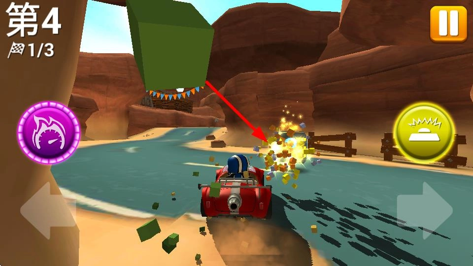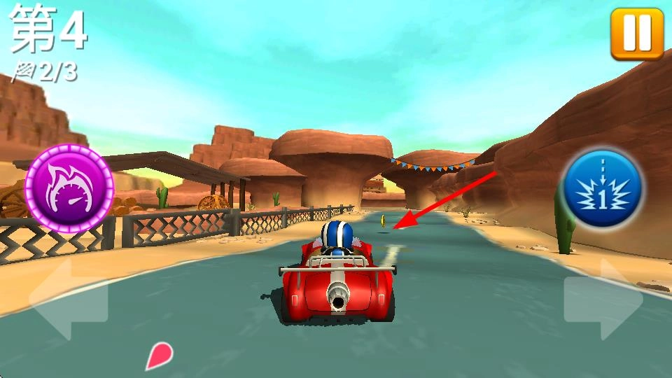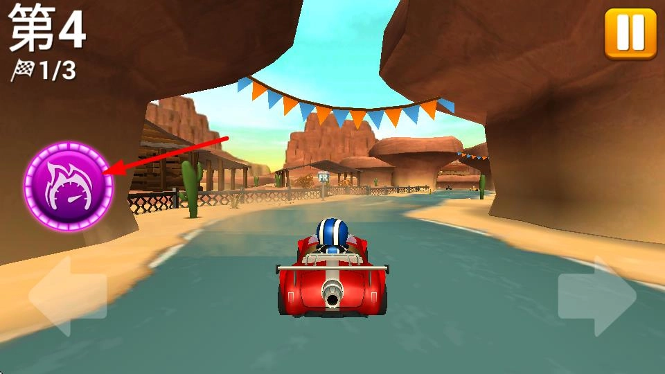 点击左侧的紫色加速技能按钮,就能触发车辆的加速效果,在比赛里迅速提高车速,抢占有利位置。