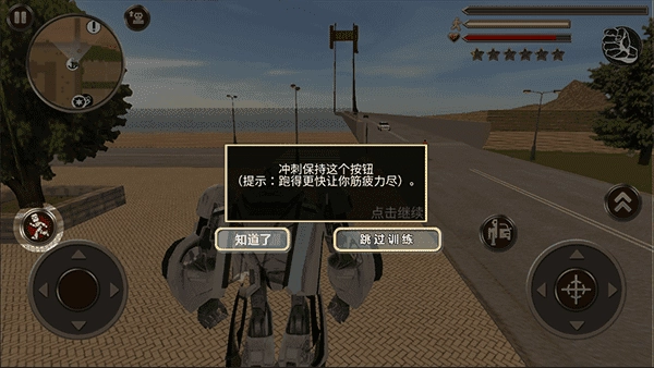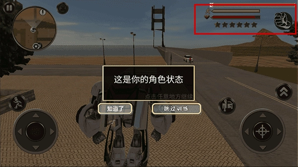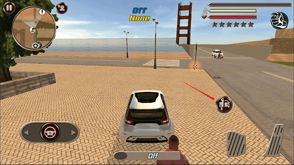 右上角会显示你的角色状态,包括体力、血量和通缉等级(提醒你不要随意攻击路人,否则会招来警察的通缉),点击拳头形状的按钮就能切换武器。