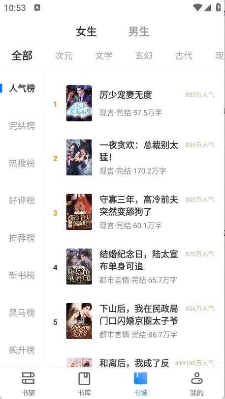 书库页面包含多种小说资源类型,像玄幻、古代和现代等。
