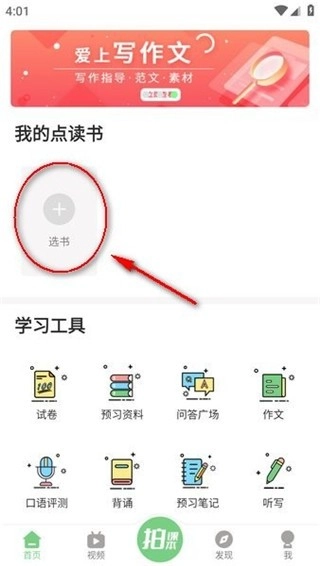 打开爱点读正版应用后,在“首页”界面点击“选书”按钮,具体操作可参照图示;