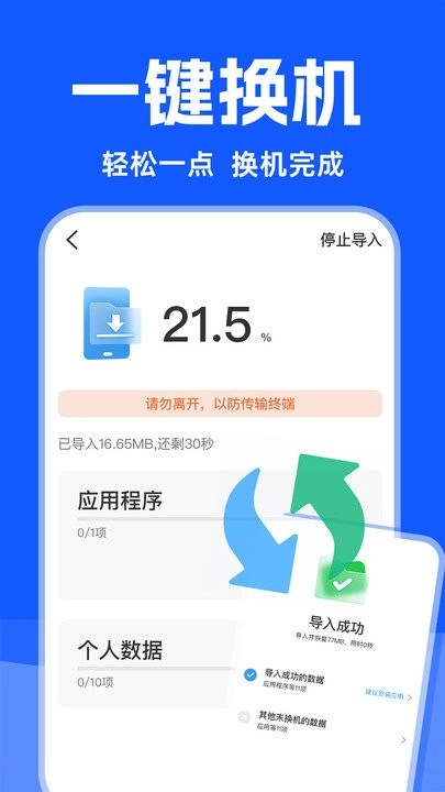【安全换机】仅支持两台手机直连传输数据,有效防止第三方截取信息,全方位保障手机隐私安全。