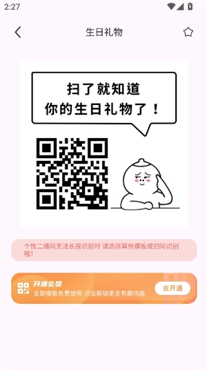 点击任意一个二维码模板进入预览界面后,可长按进行扫描识别。
