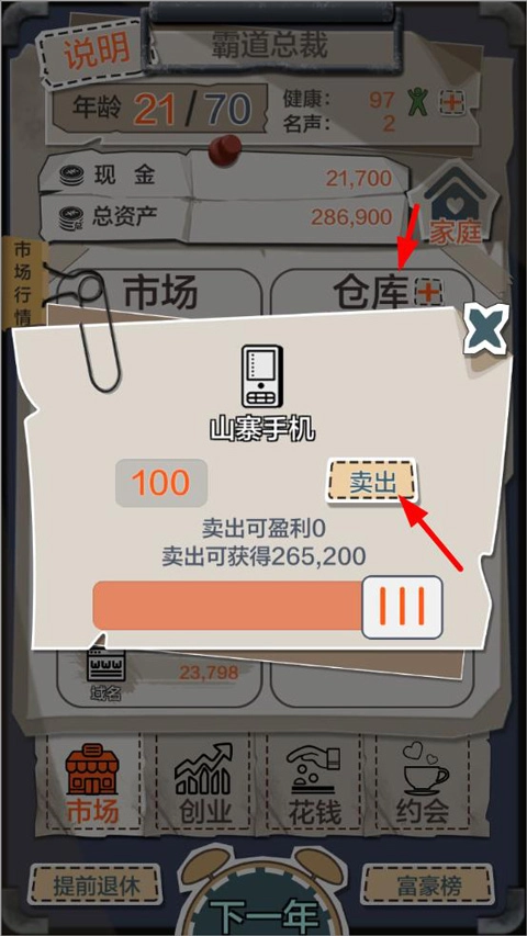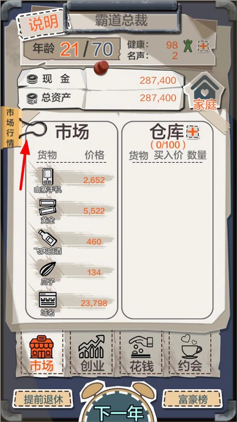 市场:点击物品即可进行买卖操作,遵循低价买入、高价卖出的原则,同时通过扩充仓库来完成资本积累。