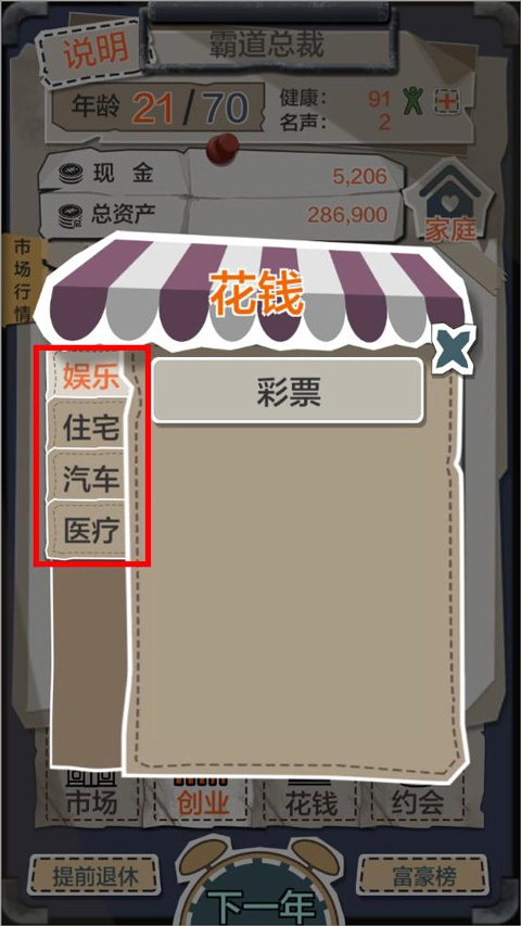 在游戏里,除了进行生意投资外,还有娱乐、住宅、医疗等其他需要花钱的方面。