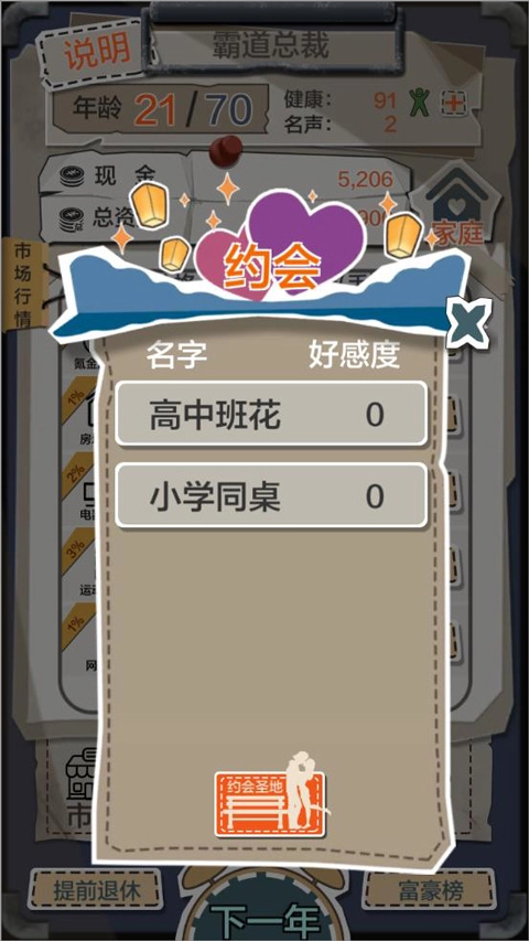 玩家在通过投资获利后,能够邀请小学同桌与班花一同约会,以此增进彼此的好感度。