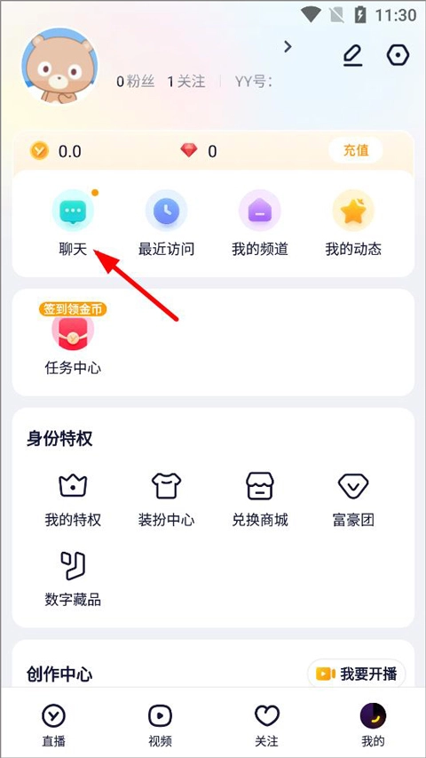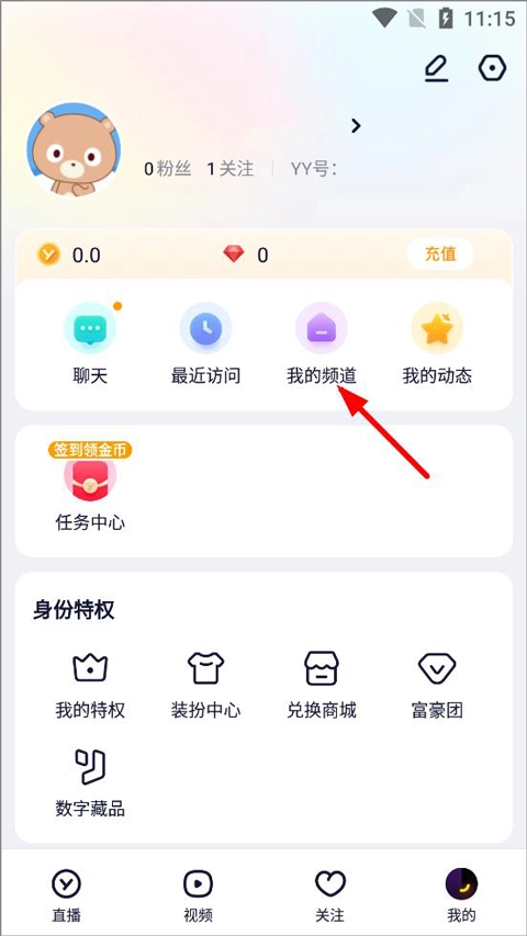 打开YY语音手机版,登录账号进入主界面后,在“我的”页面里找到“我的频道”的入口。