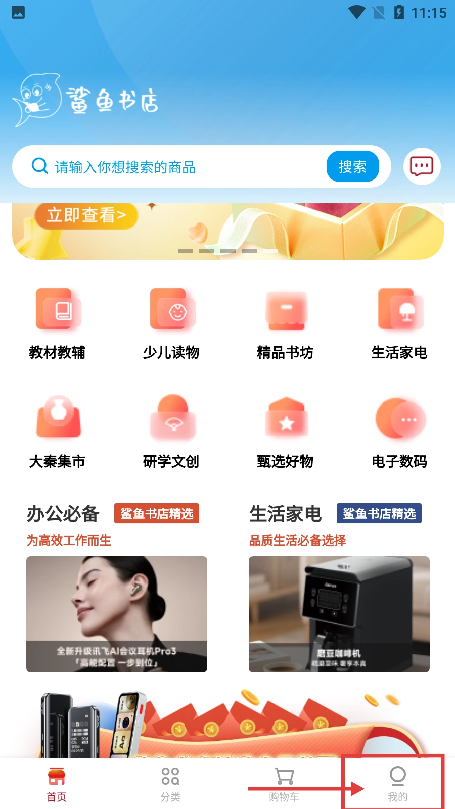 进入鲨鱼书店首页后,点击右下角的【我的】选项,即可进入个人中心页面。
