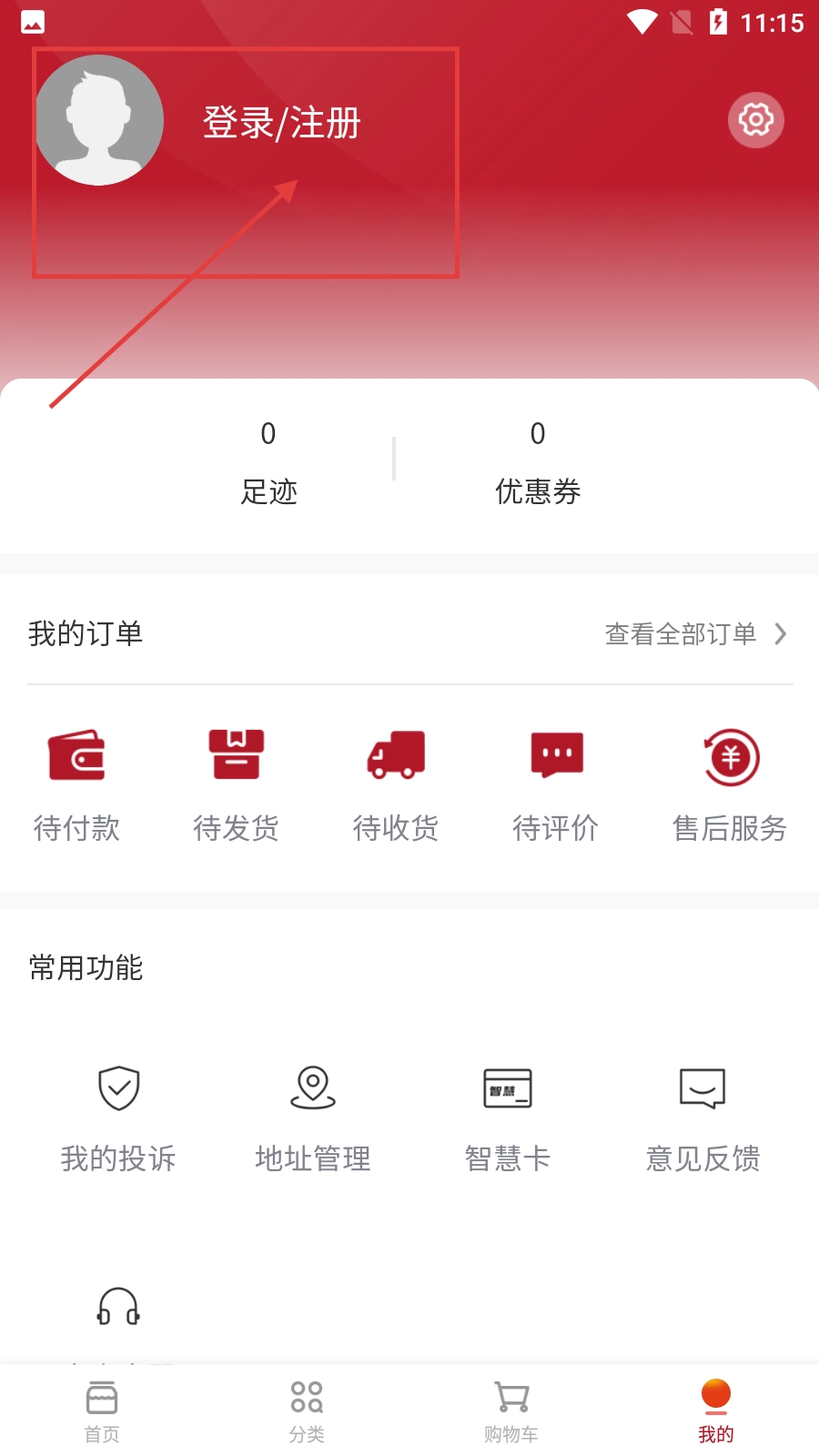 在个人中心页面找到【登录/注册】区域并点击,即可进入登录界面。