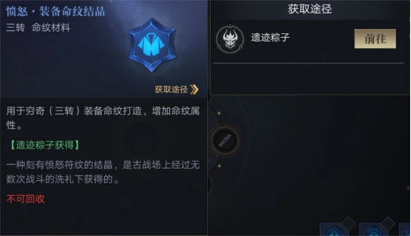 蓝色品质的命纹结晶可以通过遗迹粽子玩法获取。紫色、橙色和红色品质的命纹结晶则要通过祈命纹愿来获得。需要先去打遗迹拿到蓝色命纹,通过祈愿得到的命纹是不能直接装备的。另外,正中间位置的装备命纹所需要的材料和其他命纹的材料不一样,这种命纹的材料会在后续的活动中进行投放。