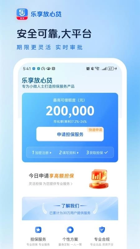 乐享放心贷是一款优质的贷款产品,无需抵押,通过手机就能轻松在线审批;纯线上操作简单易上手,用户用手机就能申请,十分便捷;最高可申请20万额度,在有效期内还能循环使用;要是还款记录良好,还能获得提升额度的机会。