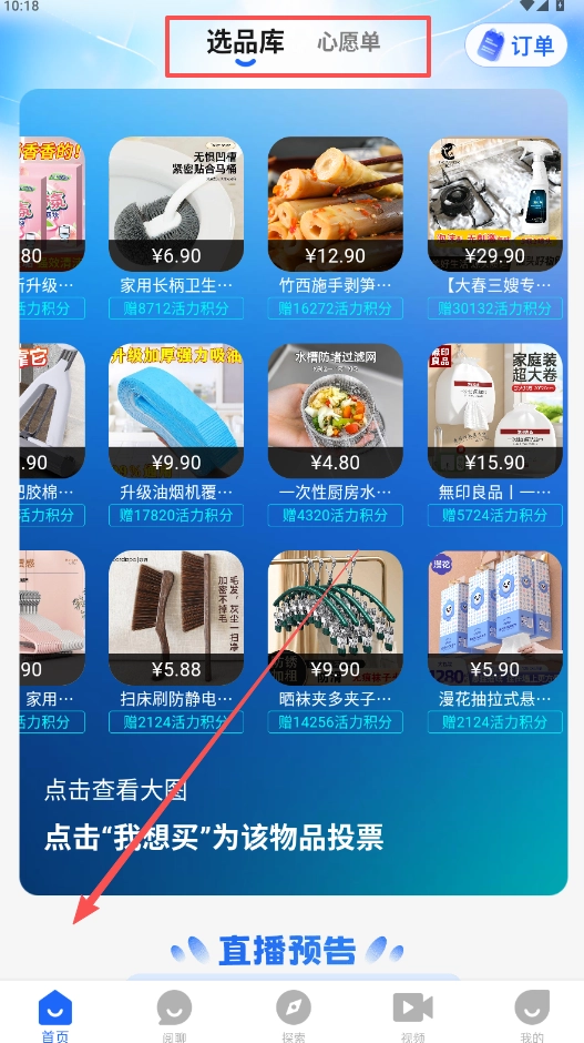注册后自动登录,进入首页后分别查看“选品库”和“心愿单”。