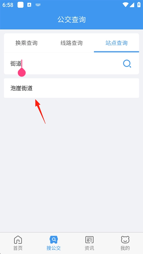 打开熊猫出行应用,进入“搜公交”页面后,在页面上方的搜索栏内输入您计划乘坐公交的站点名称,随后点击搜索结果中的对应站点即可进入该站点详情页面。