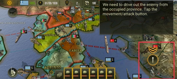把占领区的敌人赶出去,点击右下角的箭头按钮来调动部队并发动进攻。