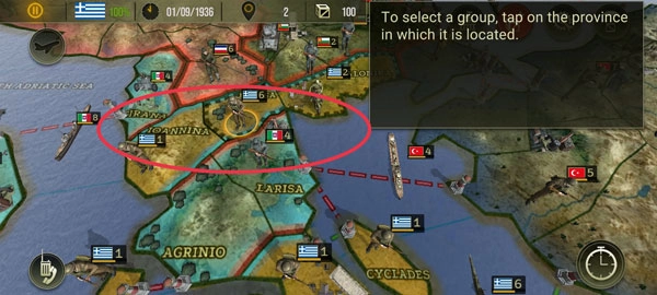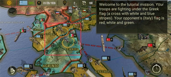 游戏开局时,你的军队会在希腊那面蓝白相间的十字旗下战斗,对手则是打着红白绿三色旗的意大利军队。