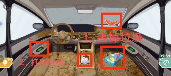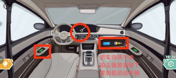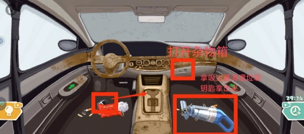 清洗干净之后再把工具放回副驾驶的抽屉,最后用钥匙点火就能过关啦。