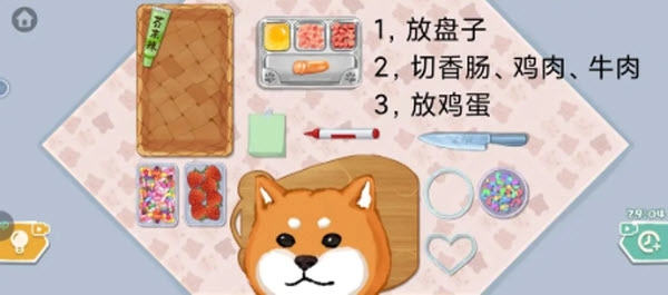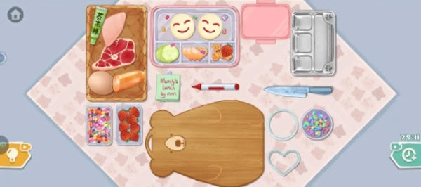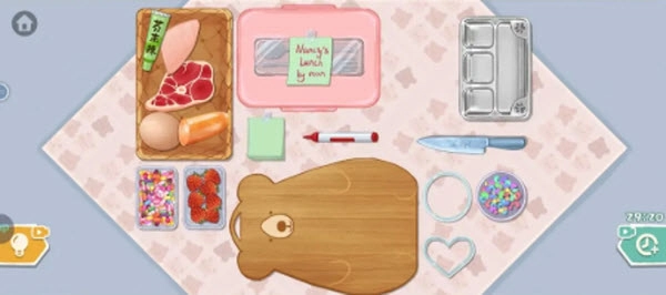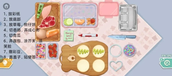 关卡首先要把右下角的亮片撒到便当盒底部,再将玻璃便当盒放进去。