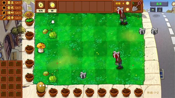 拖动上方的植物就能直接种植,像阳光菇这类植物,每次消灭僵尸后都会掉落一份礼物,打开礼物就能获取阳光。
