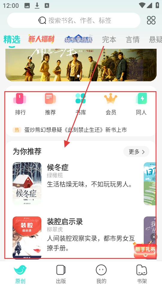 打开软件后,先在首页看看【排行】【推荐】这些板块,要是发现感兴趣的书,比如【候冬症】,就能点进去查看详情啦。