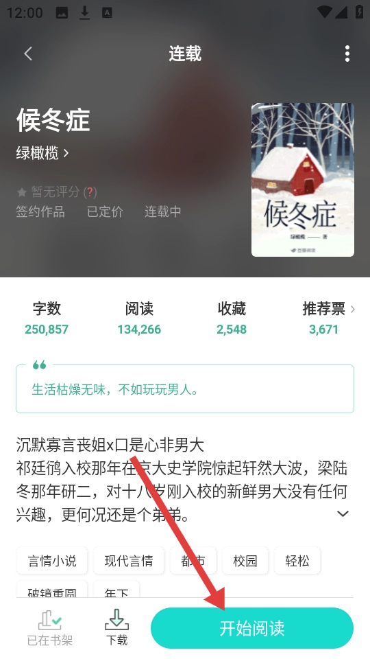 点进你喜欢的书,像【候冬症】这类,浏览完书籍的基本信息后,别再迟疑,马上点击【开始阅读】,开启你的阅读之旅吧。