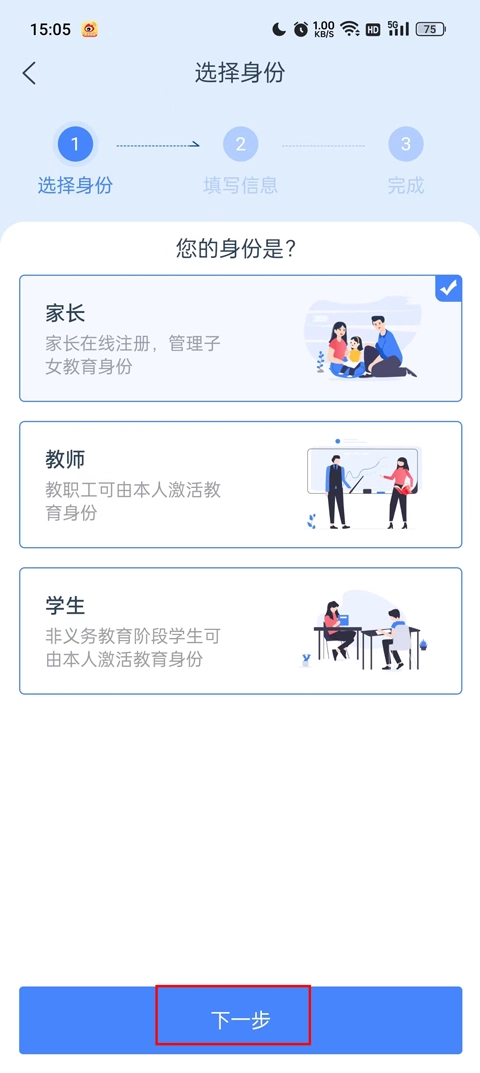 二、从里面挑选你的身份来注册,勾选好注册身份后,再点击【下一步】按钮。