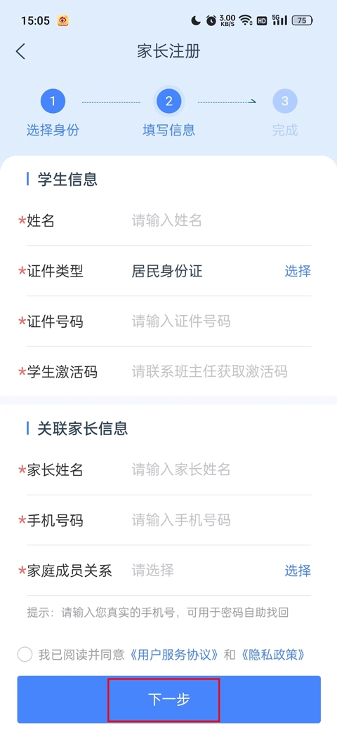 三、进入信息填写页面后,完成【学生激活码】等关键信息的录入操作,勾选相关协议,然后再次点击【下一步】按钮。若所填信息准确无误,注册流程即可完成。