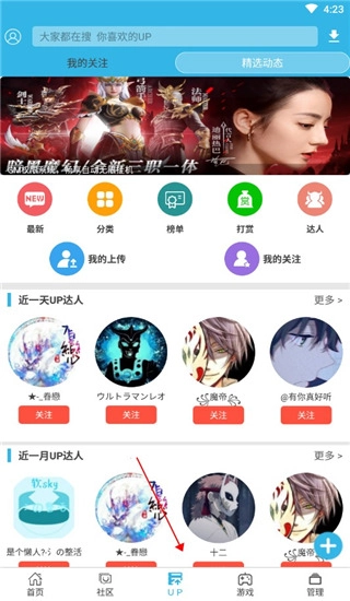 进入up板块后,用户能够查看当下热门up主的相关信息,以此获取最新动态。