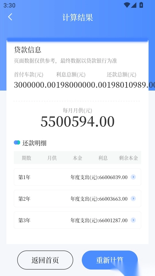 最后进入“计算结果”菜单界面,就能获取贷款计算的详细结果了
