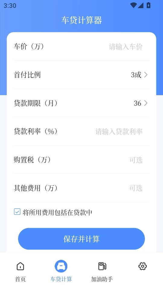然后在“车贷计算器”菜单界面,依次输入车价、贷款利率、购置税以及其他费用,接着点击“保存并计算”按钮,即可进入下一步操作。