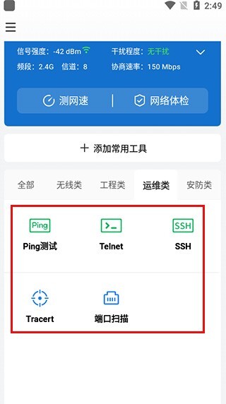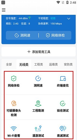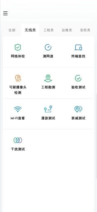 打开无线分类,即可使用网络体验、网速测试、终端查找、WiFi查看、漫游测试等功能。