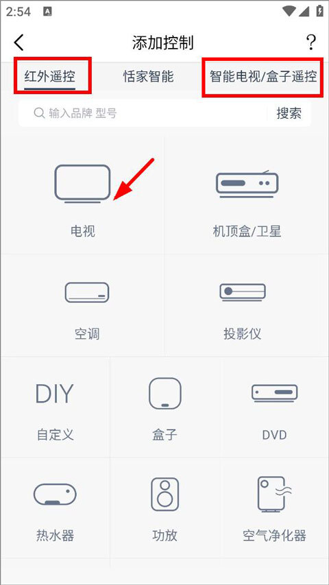 进入添加控制页面后,用户能够选择红外遥控,也可以选择智能电视/盒子遥控。