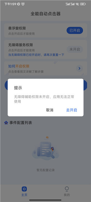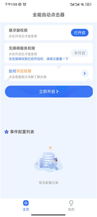在本站完成安装后,点击打开进入应用,在主页界面中,你需要开启悬浮窗权限与无障碍服务权限。