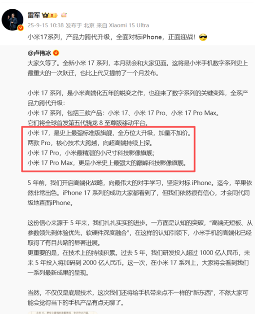 对此,雷军则表示:“小米17系列,产品力跨代升级,全面对标iPhone,正面迎战!”
