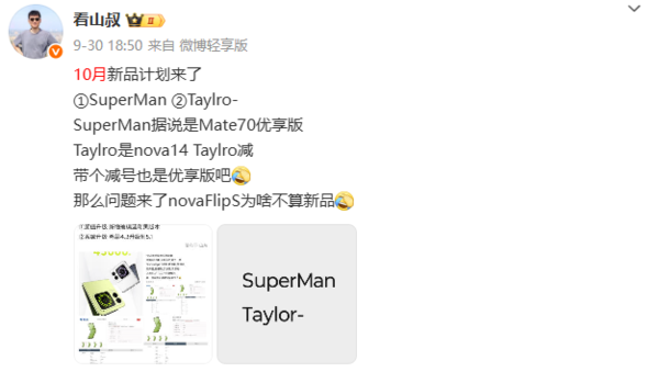 除了华为Mate70优享版的消息外,另有数码博主曝光了华为10月的新品计划。