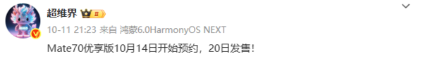 近日,有数码博主爆料称,华为Mate70优享版将在10月14日开启预约,并于10月20日正式开售。