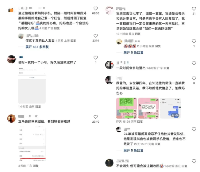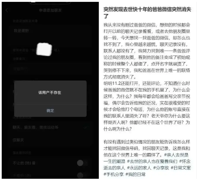 有网友发帖称,其爸爸去世近十年,想爸爸的时候会打开以前的聊天记录或者去看看爸爸的朋友圈,最近却找不到爸爸的微信了。