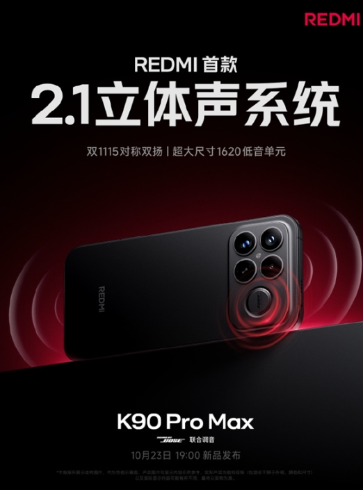 REDMIK90ProMax搭载2.1立体声系统,拥有两颗超线性扬声器+超大独立低音单元,由REDMI团队和Bose联合调音,实现低音饱满,细节丰富,人声清晰,移动声学新时代就此开启。