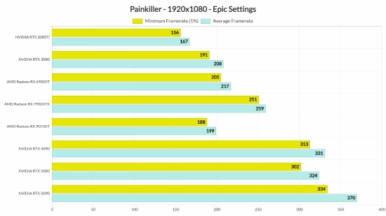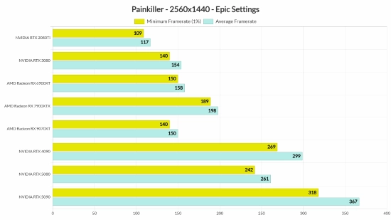 《Painkiller》主要受GPU限制,但它在各种显卡上都能流畅运行。在原生1080p/“Epic”画质下,所有显卡都能跑到120FPS以上。即便是NVIDIA RTX 2080Ti,也能全程保持150FPS以上。