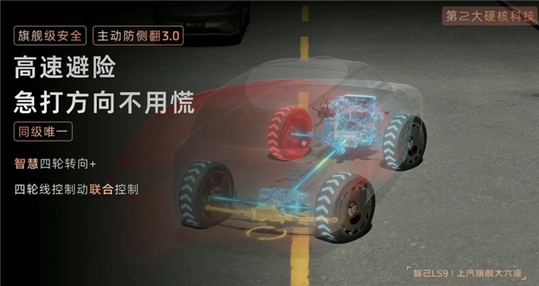 此外,由于四轮转向的稳定性,LS9还拥有高速爆胎控制系统,在高速避险时猛打方向也不用担心发生侧翻。
