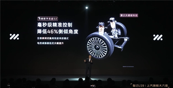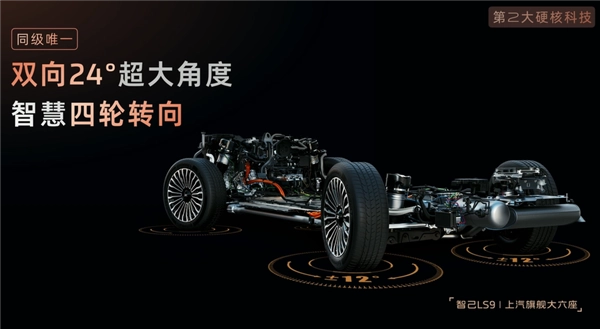 上汽智己即将开启预售的旗舰SUV LS9,搭载灵蜥数字底盘3.0,具备旗舰级底盘硬件,涵盖前双叉臂后多连杆悬架、电控阻尼减振器、双腔闭式空悬、双向24度四轮转向以及MK C2线控制动系统。