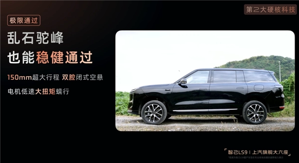 最后,LS9搭载双腔闭式空悬系统,其行程达到150mm。当空悬升至最高状态时,车辆的通过能力可与硬派越野车型相媲美。再结合电机低速大扭矩的特性,即使面对乱石驼峰桥,LS9也能轻松通过。