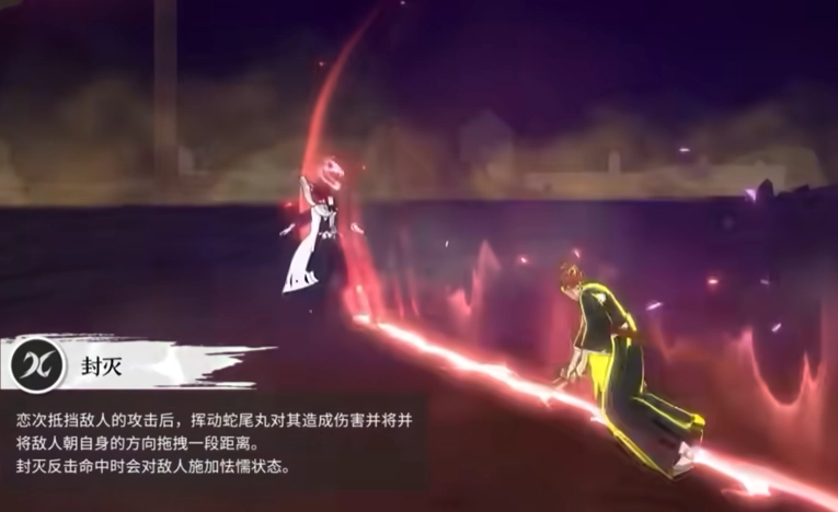 3、封灭当阿散井恋次把敌人的攻击给抵挡主以后,在次会晤蛇尾丸砍向对手时能够给其造成伤害并且还能降敌人朝着自身的方向给拖拽一段距离,封灭反击命中对手时,百分百的会给敌人附加上怯懦的状态。