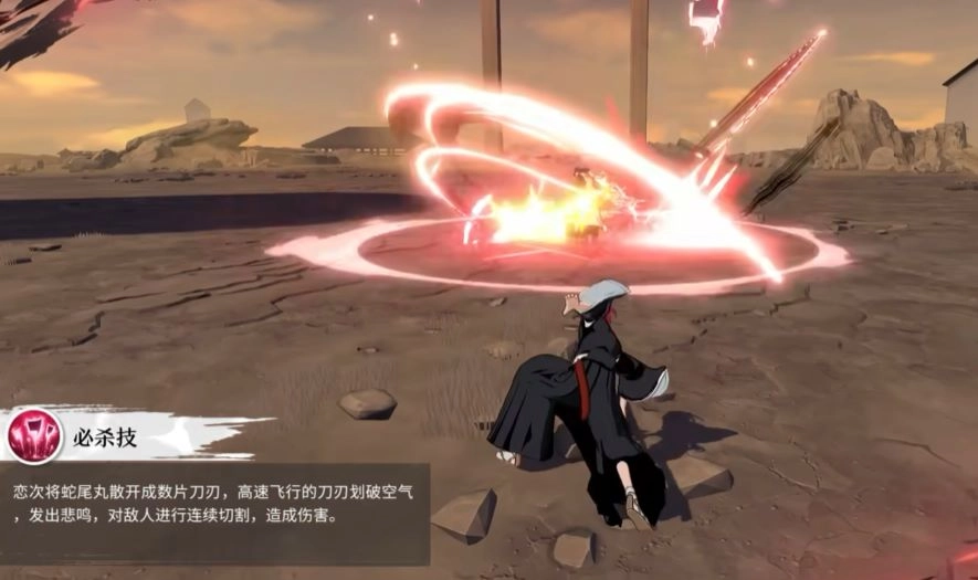 4、必杀技 恋次的必杀技能可以直接让武器化身成为无数片刀刃,朝着敌人的方向快速的攻击,刀刃高速飞行时划破空气会发出悲鸣,一旦刀刃命中对手就会开始对敌人进行连续的切割,给敌人造成致命的伤害。