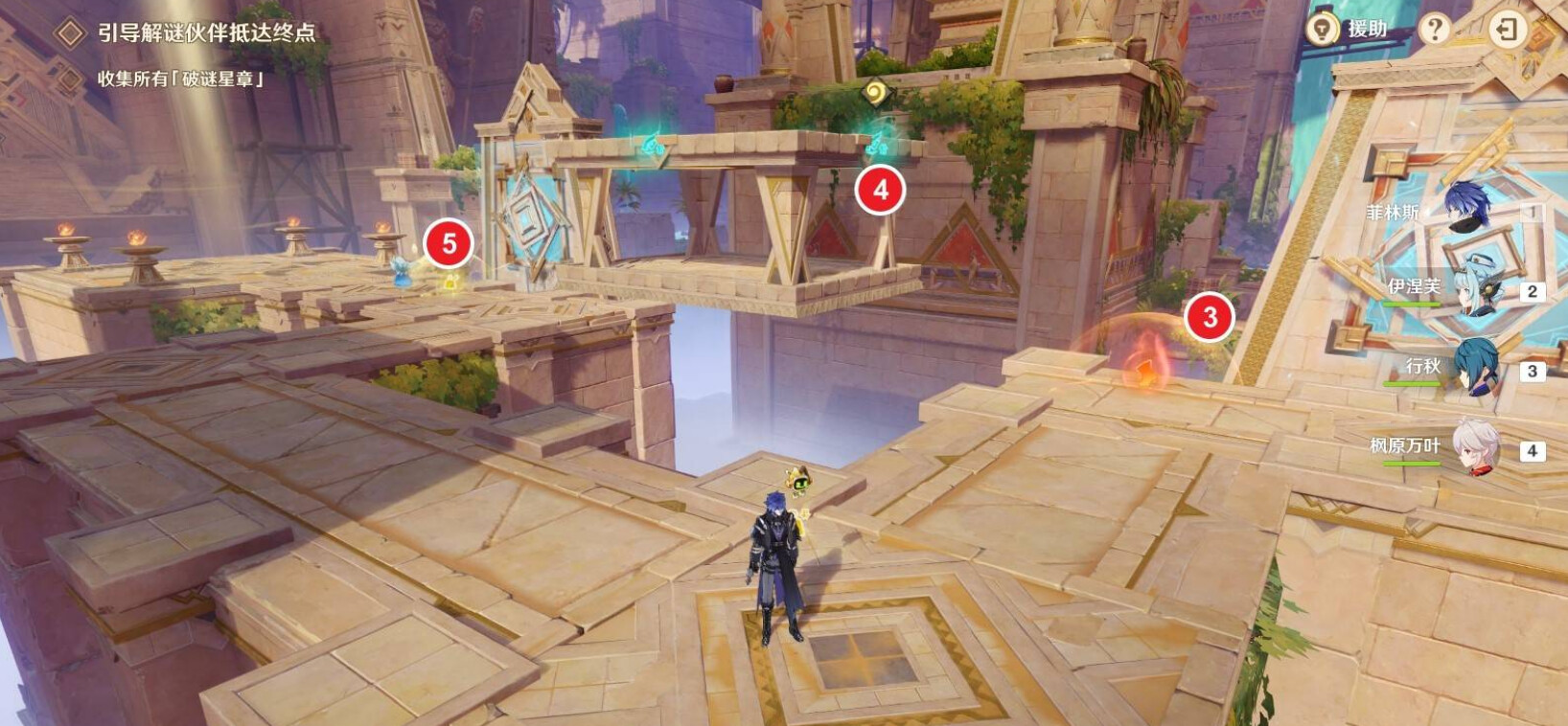 具体操作步骤为:先依照下方图片序号顺序,摆好①②③以及⑤位置的增益效果。随后,站在②和④之间,待珐露珊解谜伙伴吃到第一个跳高增益后,迅速拾取②处的跳高增益。当珐露珊解密伙伴走到④所控制的平台上时,将刚刚拾取的增益放置在④的位置即可。