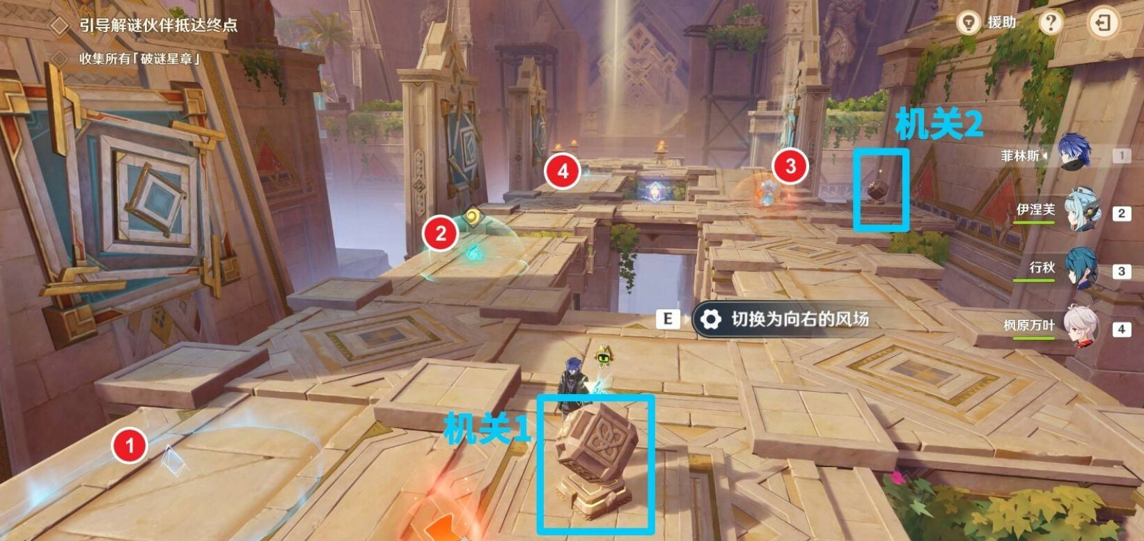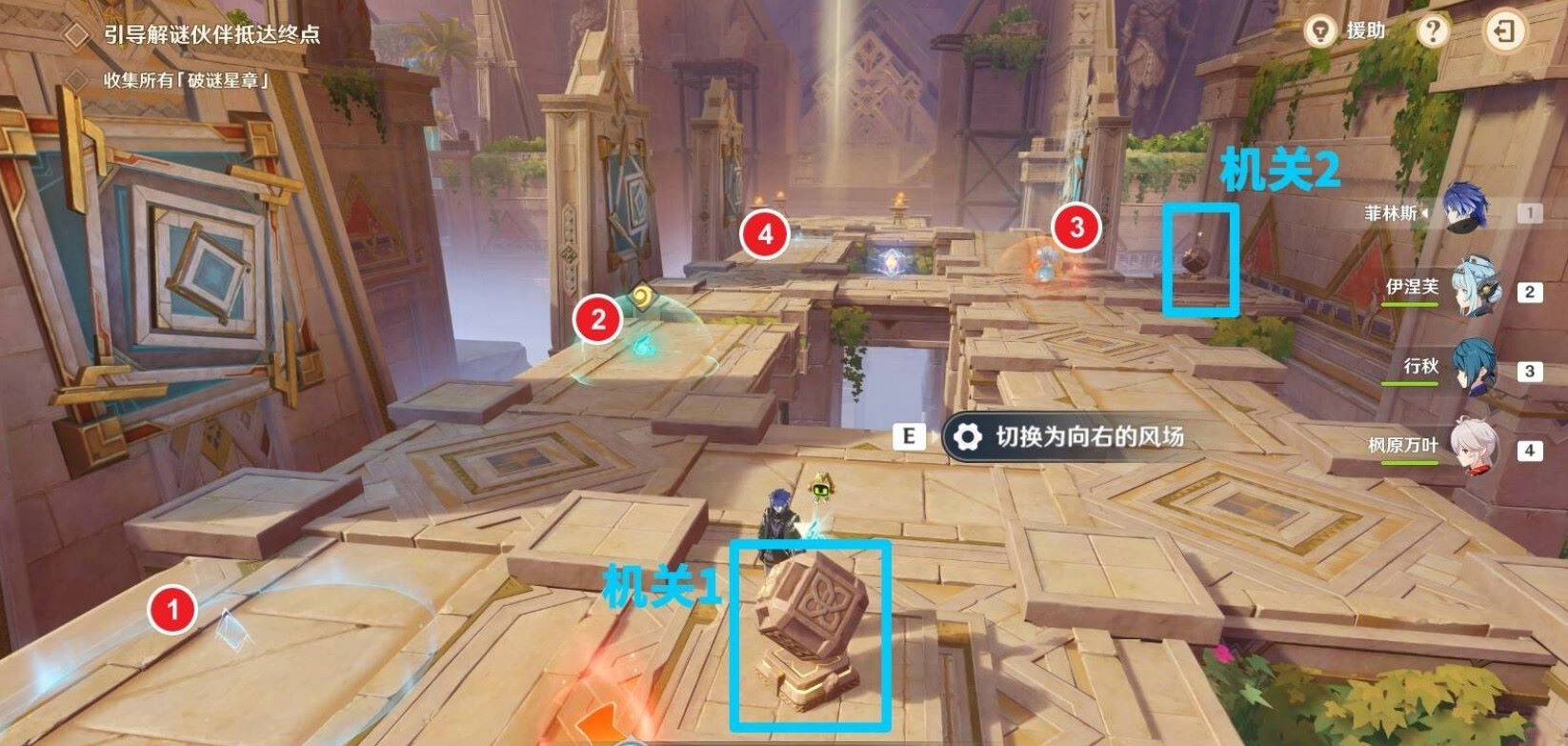 当珐露珊的解谜伙伴抵达序号①所在位置时,再次与机关进行互动,以此开启珐露珊左侧(即下图左侧)的风场。接着,待珐露珊拾取序号③处的加速增益并到达斜坡另一侧后,与机关互动,开启珐露珊右侧(也就是下图右侧)的风场,这样就能通过斜坡另一侧的坑了。