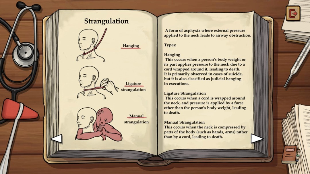 玩家需要深入探索那透着诡异氛围的案发现场,细致地分析每一条线索,进而完成死亡证明、医疗记录等专业的法医学文书。