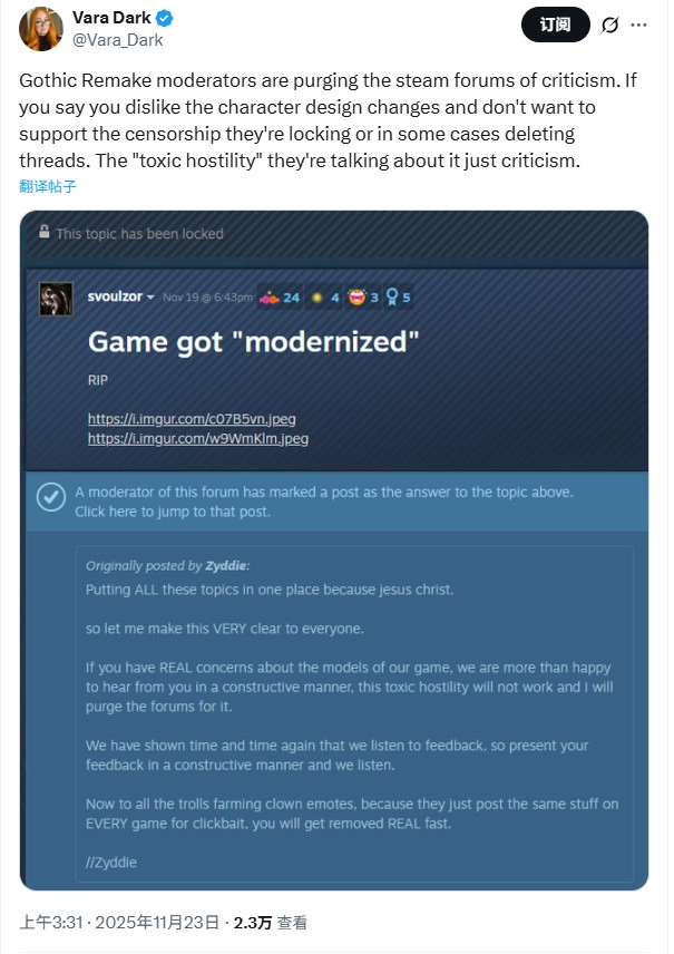 然而,一旦有玩家在Steam讨论区指责这款游戏走向“woke”,论坛版主便会清理Steam论坛上的这类批评言论。要是你表明不喜欢角色设计的变动,且不愿支持这种审查机制,版主就会锁定帖子,甚至在某些情形下直接将其删除。实际上,他们所谓的“恶意敌意”,不过是玩家的批评罢了。