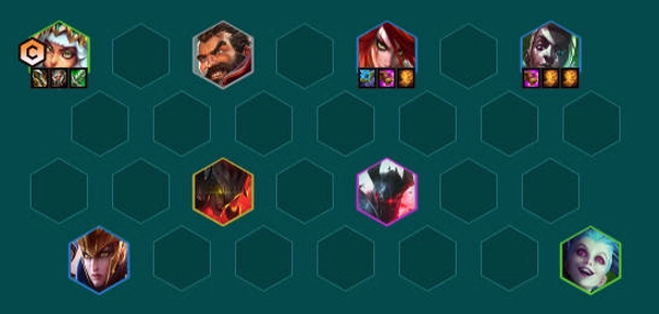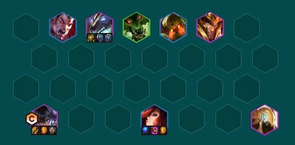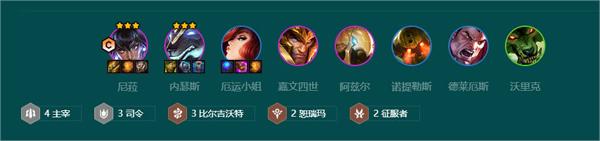 2、阵容站位前排站主宰抗伤害,尼菈站在狗头身后,有薄暮法袍减护甲可以加强尼菈的输出。亚托克斯来了换沃里克,普朗克来了换厄运小姐。