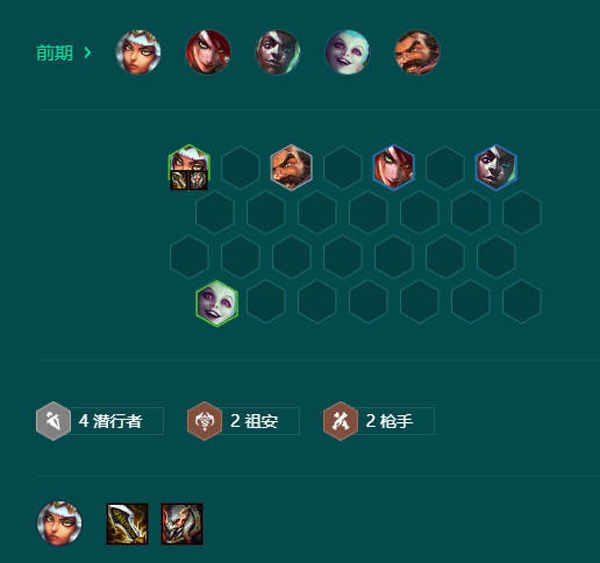 2、阵容站位潜行站站第一排,优先吃第一波伤害触发潜行效果去切后排。其余前排卡站在第三、第四排即可。副C艾克/卡特与琪亚娜站两侧,保证稳定切到C位 。