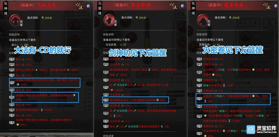 7、剑大法:装备橙红武技/灵技-25%冷却时间、身法-50%冷却时间、装备橙红绝技-25%冷却时间