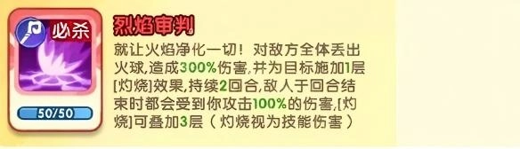 就让火焰净化一切!对敌方全体丢出火球造成300%伤害,并为目标施加1层[灼烧]效果,持续2回合,敌人于回合结束时都会受到你攻击100%的伤害,[灼烧]可叠加3层(灼烧视为技能伤害)